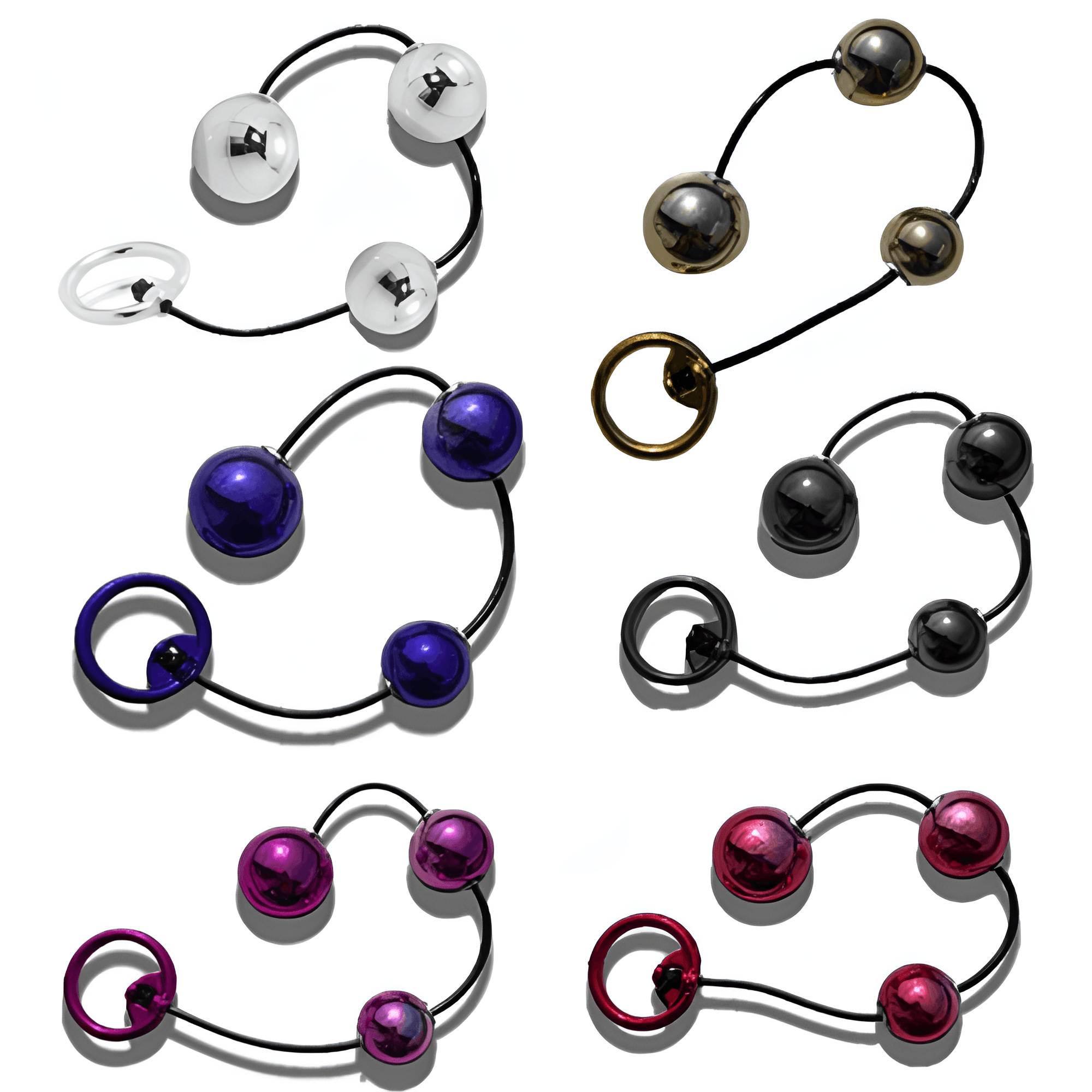 As bolinhas ficam presas sobre um cordão de silicone e ainda possui alça de segurança para que não ocorra imprevistos, elas possuem três tamanhos diferentes que começa pelo maior na ponta do cordão, em sequência vem a média e finaliza com a pequena.